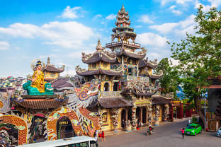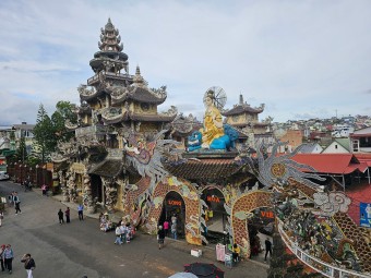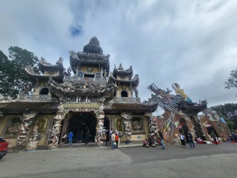 달랏에서 약 8km 떨어진 곳에 위치한 링응 사원은 독특한 건축 양식으로 유명합니다. 사원의 외벽은 깨진 유리 조각과 도자기 파편으로 장식되어 있어 화려하고 독특한 모습을 자랑해요. 특히 49m 높이의 용 모양 탑은 이 사원의 상징적인 건축물입니다.